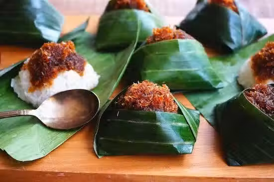 5 取大約60克的糯米飯舀在香蘭葉上, 再舀大約20克的炒香椰絲放在糯米飯上, 然後裹好即可