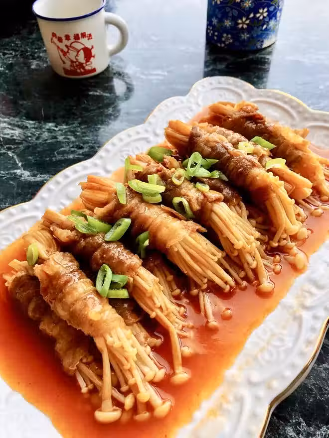 2. 金針菇洗淨撕小塊,用一塊肥牛把金針菇捲起來