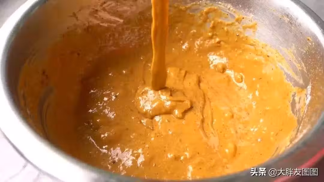 15分鐘之後倒入黃油還有泡打粉,拌均勻。不加泡打粉發不起來。