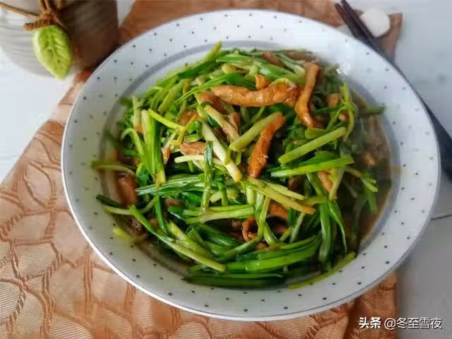 【肉絲炒蒜苗】所需材料:蒜苗250克、豬肉150克、油鹽適量、姜1片、料酒1/2湯匙、生抽1湯匙、白鬍椒粉1/2茶匙、