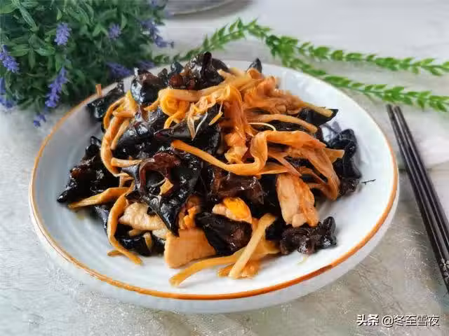 【木耳黃花菜炒裡脊】所需材料:木耳(干)30克、黃花菜(干)1把、豬裡脊150克、油鹽適量、蔥1段、姜2片、大蒜2瓣、料酒半湯匙、生抽1湯匙、雞精1茶匙、水澱粉適量、
