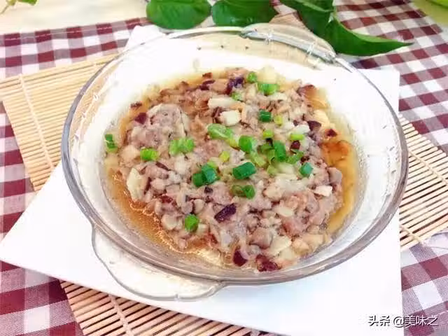 7、撒上蔥花,香菇馬蹄蒸肉餅做好啦!
