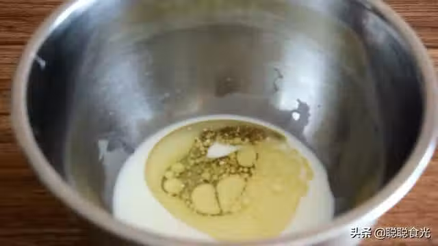 步驟三:準備一個深一點的盆,把牛奶玉米油倒入盆中,然後用麵粉篩篩入低筋粉,用手抽攪拌至均勻無乾粉,無顆粒。