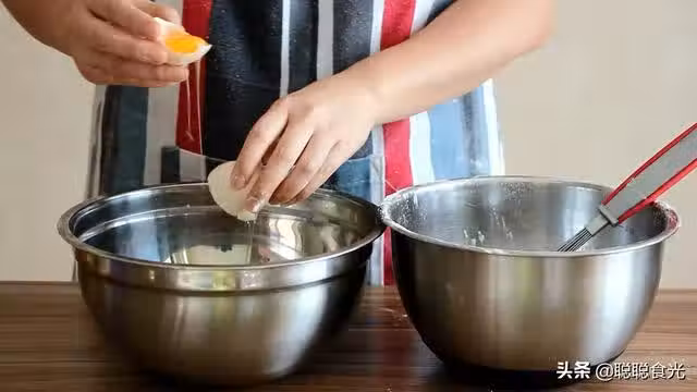 步驟四:準備一個無油無水,深一點的盆,把雞蛋的蛋清蛋黃分離,蛋清打入無油無水的盆中,蛋黃直接放入之前調好的麵粉糊中。