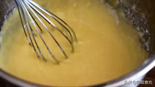 步驟五:用手抽把蛋黃麵粉糊混合均勻,盡量用用劃十字攪拌,不要用力轉圈攪拌,避免麵糊起筋,影響蓬鬆程度。