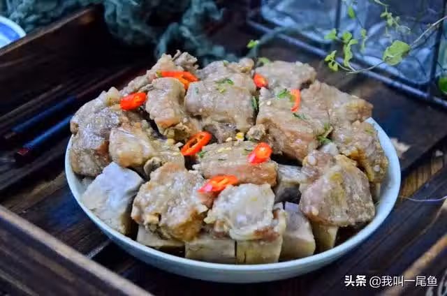 材料:排骨400克、芋頭300克、大蒜1個、辣椒1個、生薑2片、生抽2湯匙、蚝油1湯匙、玉米澱粉3克、鹽4克、料酒2湯匙、胡椒粉少許