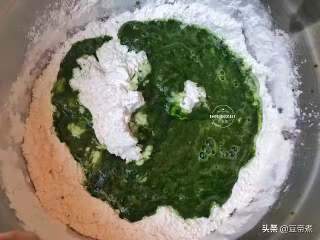 5、然後把粘米粉倒入盆中,再加入所需要的艾葉糊。在倒入艾葉糊的時候,要注意留手不要一下子全部倒進去。因為每個人做打的艾葉糊含水量不一樣。