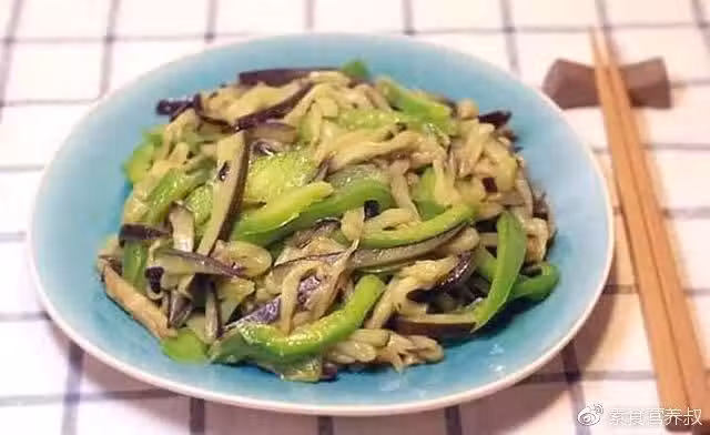 1、茄子、青椒洗凈,切成粗細條,油燒熱後倒入茄子條和青椒翻炒。