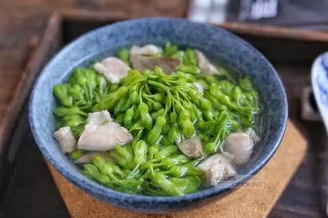 4,把豬雜倒入煮沸的清水裡面,大火再煮沸,放入夜蘭花,翻勻至顏色變綠。
