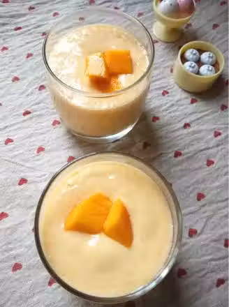 芒果切花刀,果肉切成丁,放入果汁機,倒入酸奶打成汁,倒入杯中,上面點綴兩個小芒果丁。