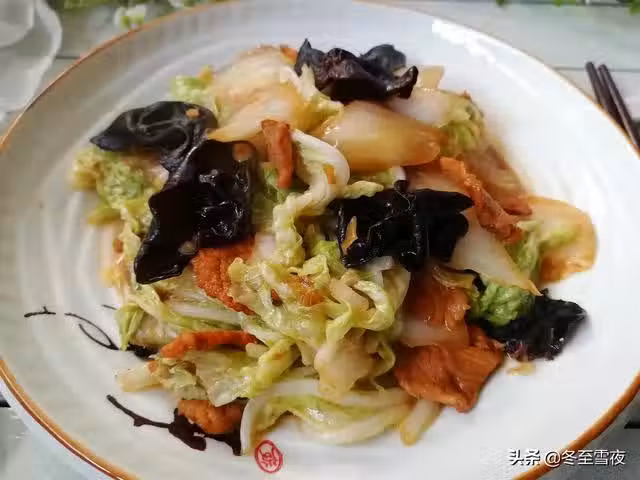 【木耳肉片炒白菜】所需材料:白菜、木耳、豬肉、油鹽、蔥、姜、大蒜、醬油、料酒、澱粉、米醋、