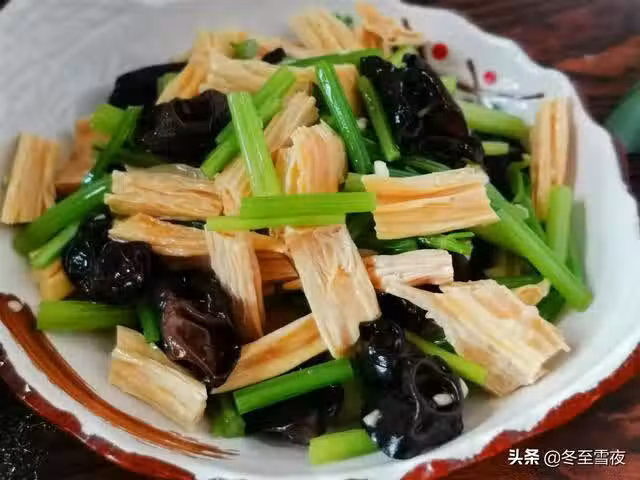 7.將芹菜、木耳和腐竹放在盆內,加入炸好的花椒油,鹽,翻拌均勻,盛出裝盤即可。