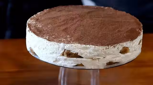 11、 然後將這個放入冰箱冷藏4個小時後取出,將可可粉撒在胚子上面,也可以擺上一些喜歡的水果裝飾一下。