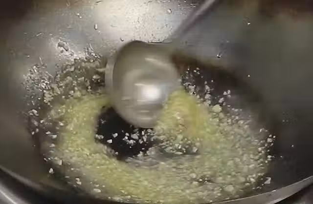 4、倒入上海青,快速的翻炒幾下。倒入一些水澱粉和香油,水澱粉遇熱糊化,能把調料粘附在青菜上面比較入味,翻勻就可以出鍋裝盤。