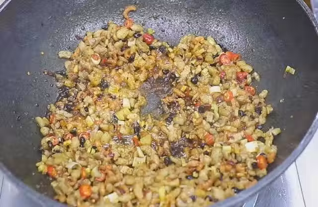 4、調味加入一勺香辣醬,把醬料炒香,給肉丁上色。倒入蔥姜、小米辣,繼續炒出料頭的香味,加入生抽、白糖提鮮,味精、蚝油調味,食鹽不再放,海米、醬料都是鹹的。顛鍋翻炒化開調料。