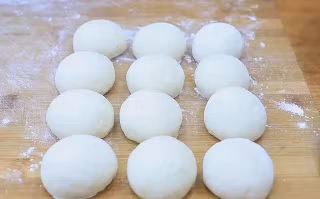 5、麵糰發酵好蜂窩孔非常的密而細膩,在案板上撒上底面,取出麵糰搓揉排氣,然後搓成長條,再切成大小相同的面劑,每一個面劑都搓揉一下,搓成圓面坯放在一起,放置鬆弛一下,用白細布蓋住,防止面坯風乾、表皮起皺。