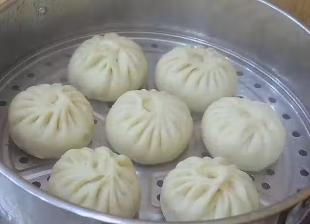 7、取出蒸籠,底部刷油防止粘鍋,然後把包子放在蒸籠中,別放太擠,加熱過程中還會膨脹。涼水下鍋,水開計時,蒸15分鐘包子就熟了。此時不要急著掀開鍋蓋,停上2分鐘,讓包子自然降溫,免得突然遇涼,收縮塌陷。2分鐘後就能吃了。