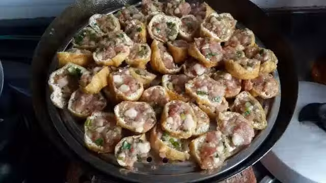2、豬肉、蝦米、冬菇一起搗碎,芋泥和其他配料一起攪拌均勻,釀進油豆腐裡面,落油鑊中炸一下,再放入豉油燒至熟透即可。