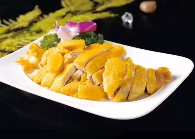 3、用旺火燒熱炒鑊,下粗鹽炒至高溫,取出1/4放入沙鑊,把雞放在沙鑊內,將餘下的鹽覆蓋在雞上,蓋嚴鑊蓋,用小火焗約20分鐘至熟。把雞取出,揭去紗紙,剝下雞皮(待用),將雞肉撕成塊,雞骨拆散,加入味汁拌勻,然後裝盤(骨在底下,肉在中間,皮蓋在上面),拼擺成雞的形狀,香菜放在雞的兩邊即成。