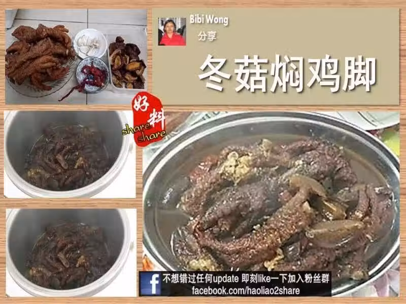 辣椒幹(愛辣就放多點),雞腳20個(炸好),蒜頭 6 顆,香菇,蠔油 3湯匙,老抽2湯匙,鹽少許,味精少許,水 適量