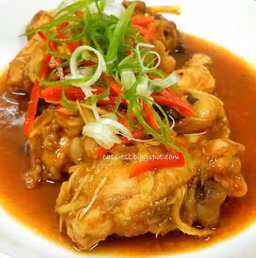 2)雞腿與調味料醃20分鐘入味,再放入薑絲,2/3的紅辣椒絲,移入電鍋煮熟至開關跳起,上桌前擺上蔥絲幾剩下1/3的紅椒絲即可食用。