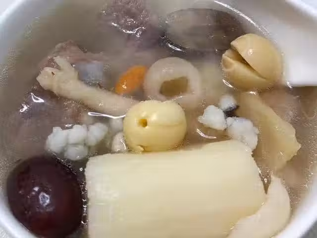 食材準備:豬骨頭、淮山、蓮子、芡實、桂圓、沙參、玉竹、百合、紅棗、蜜棗、枸杞子、薑片、蔥段。