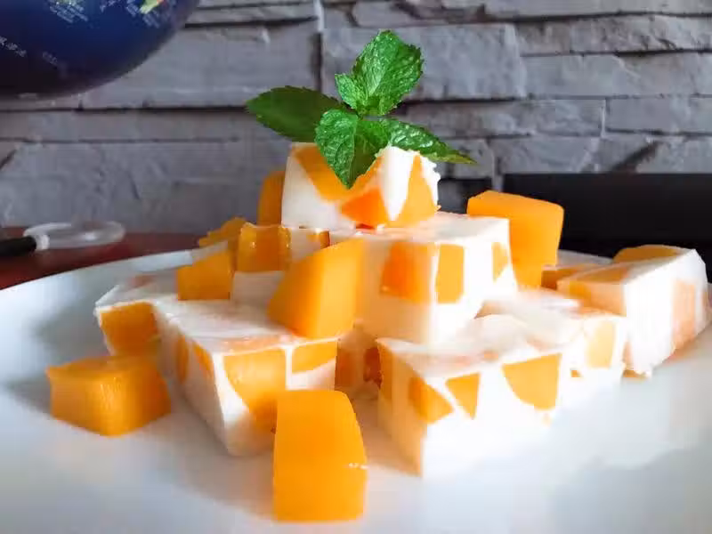 3、 芒果切粒放入碗中,倒入奶液,送入冰箱冷藏 4 小時。