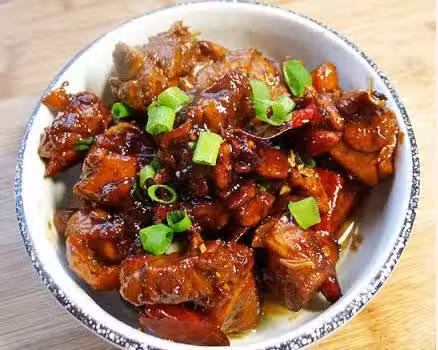 2、加入干辣椒略炒出味,濾掉煸出的鴨油,加一定比例的醬油、食醋、白糖和料酒,隨後加溫水,沸騰後蓋上鍋蓋,轉小火燜燒;