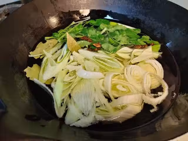3、炸香料的過程中要全程保持小火,讓香料的味道慢慢滲透到油中,如果火太大的話,香料的香味不能很好地滲透到油中。炸香料的過程大概需要十幾分鐘,把香料炸香、炸干後撈出料渣。