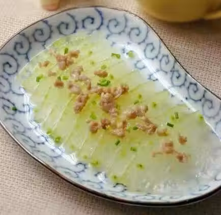 將冬瓜片放入盤中鋪平,將腌好的肉末鋪在冬瓜上,放入蒸鍋里,用中火蒸8分鐘至冬瓜熟透,出鍋滴上幾滴香油,撒上蔥花即可