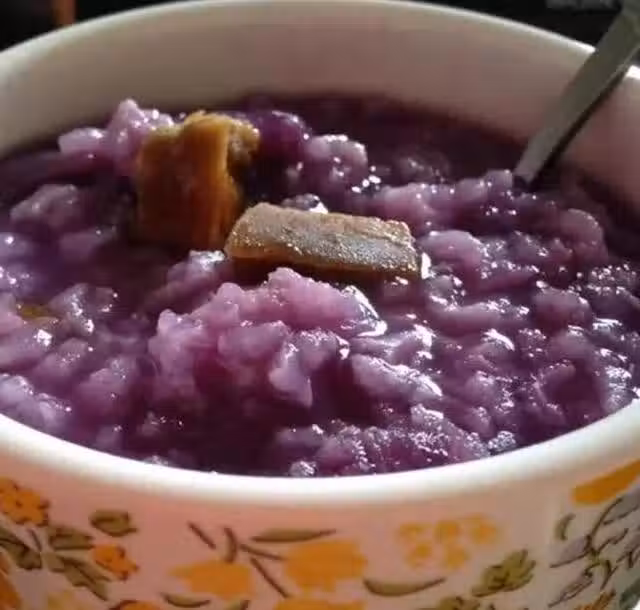 3、將糯米和適量水放入鍋中,大火煮開,加入紫薯、南瓜、紅棗和桂皮,轉小火煮至米爛粥稠即可。
