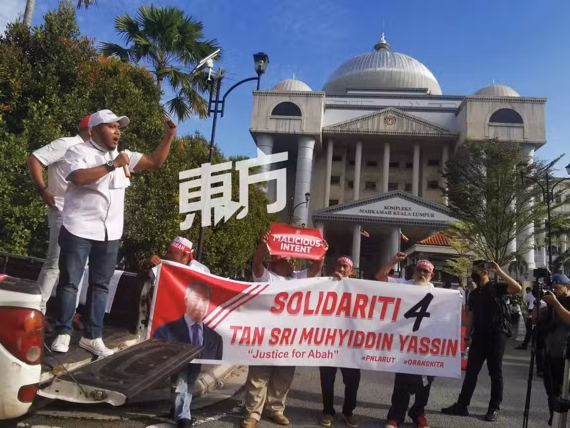 8.41AM:慕尤丁抵達法庭,在進入法庭前一度引起一陣騷動,並在一眾國盟領袖迎接及陪同下,面帶微笑進入法庭。
