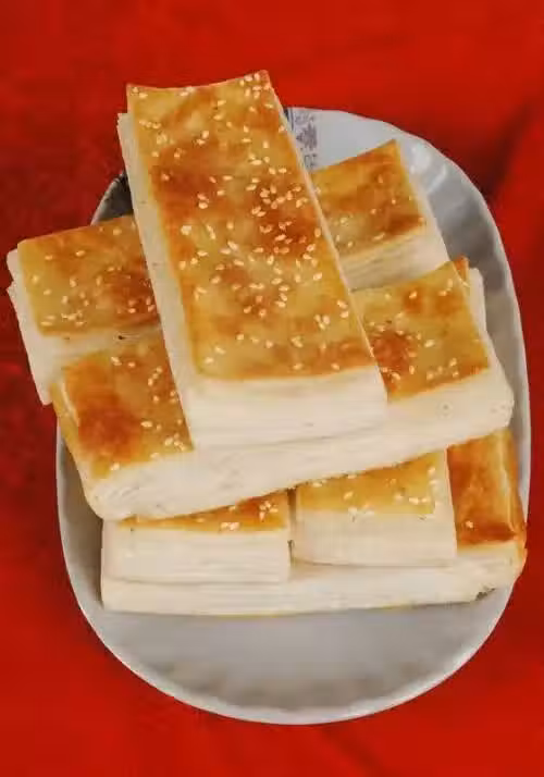 11.平底鍋內放油,下入千層餅,小火將其煎黃一面之後翻面,最後煎至兩面金黃中間熟透即可