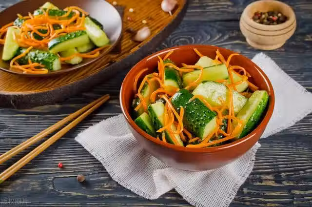 1、胡蘿蔔、黃瓜洗凈,切成適當大小的塊。