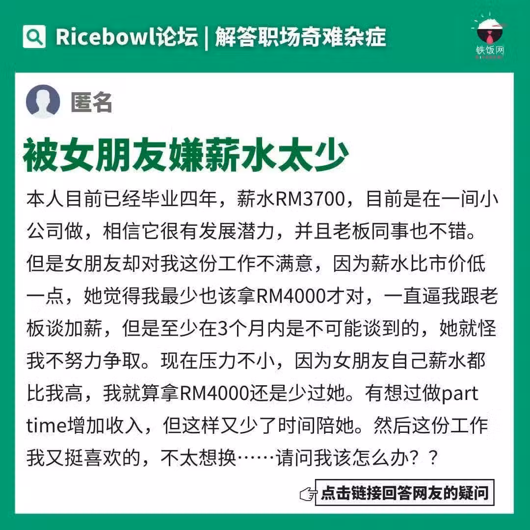 大馬男子分享:目前薪水RM3700,女友一直要求我辭職換工「至少拿RM4000才對」