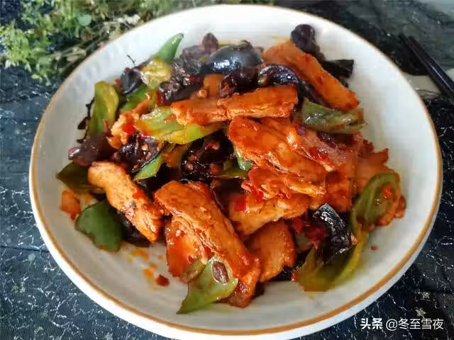 6.再下入尖椒片,木耳,翻炒1-2分鐘,炒制時間不用過長。