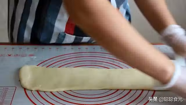 步驟六:把其中的一塊放在案板上,不用揉,輕輕用手按壓成長條,然後用擀麵杖擀長,寬度不要太寬,因為炸的時候還要抻一下,太長了鍋的口徑不夠炸。麵糰很柔軟很容易擀長。