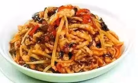 4.再加入肉絲、加入胡蘿蔔絲、青椒絲、1小勺醋、半小勺白糖。