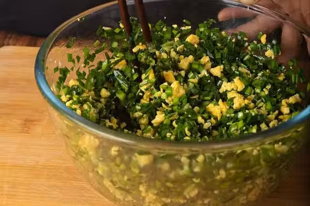 3、之後,肯定不少人都會選擇,直接將韭菜倒在裡面,一起混合,實際上這方法大錯特錯,絕對出水非常嚴重。正確做法是,往韭菜中倒上適量的香油,拌勻以後再將其和其他配菜混合。