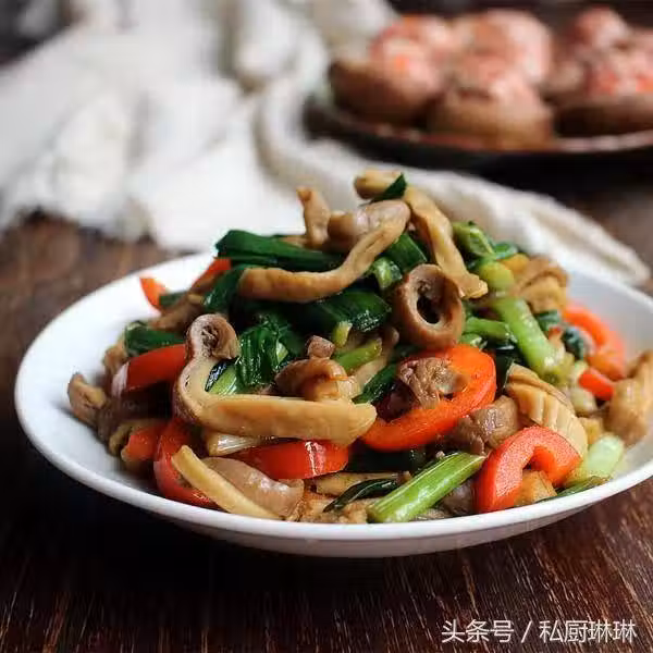 8.倒入豬肚尖,大火炒3秒左右,試味按自己味道再調入鹽即可,放入香蔥段,即可裝起食用,也可以加入幾滴老抽上色;