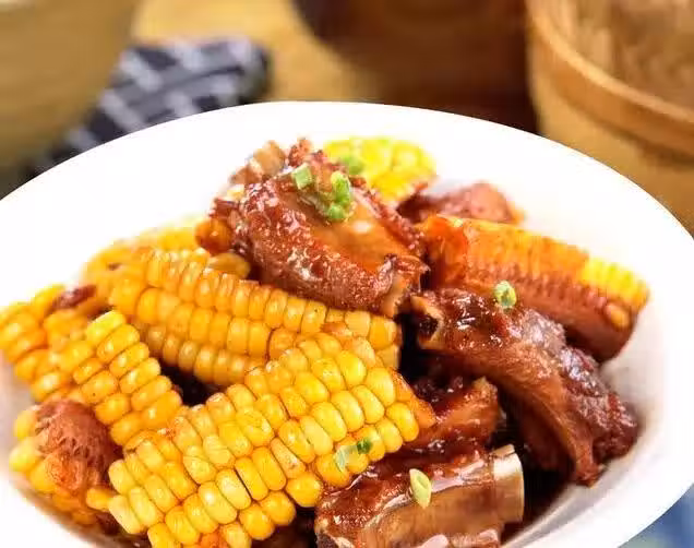 7.加入玉米段和花生米, 蓋上蓋, 再燉上10分鐘;