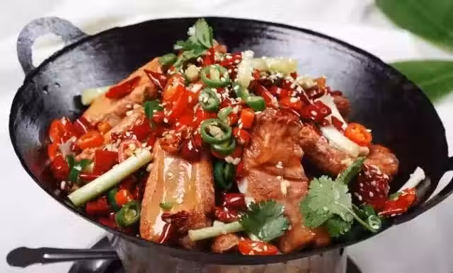 5.加入大勺豆瓣醬,炒出香味,加入排骨,進行翻炒。