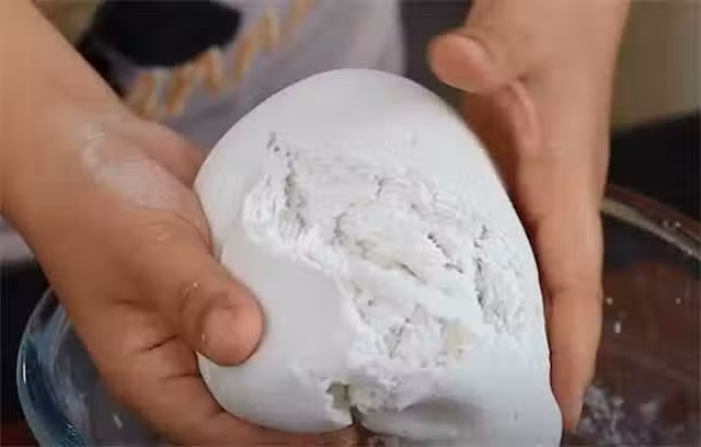 2.時間差不多到了,麵糰在鬆弛過程中會產生很多小氣泡,只是這些小氣泡你看不到而已,輕輕用手掰開,你就能感覺到麵糰特別的鬆軟。
