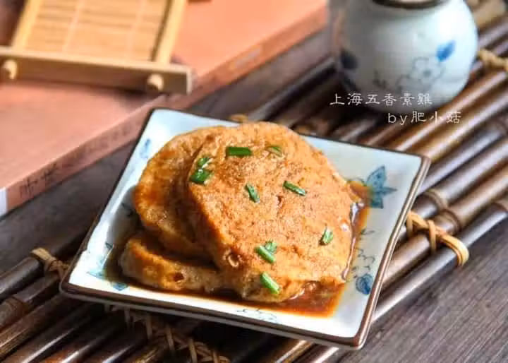 5. 準備一個碗,放半碗涼開水,將煎好的素雞泡在涼水裡,約10分鐘左右。