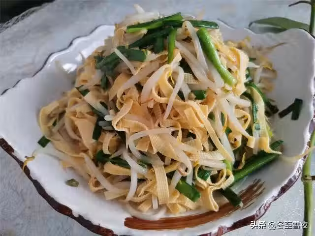 【素炒三絲】所需材料:綠豆芽400克、干豆腐(豆皮)2張、韭菜1把、油鹽適量、姜2片、大蒜2瓣、雞精1茶匙、