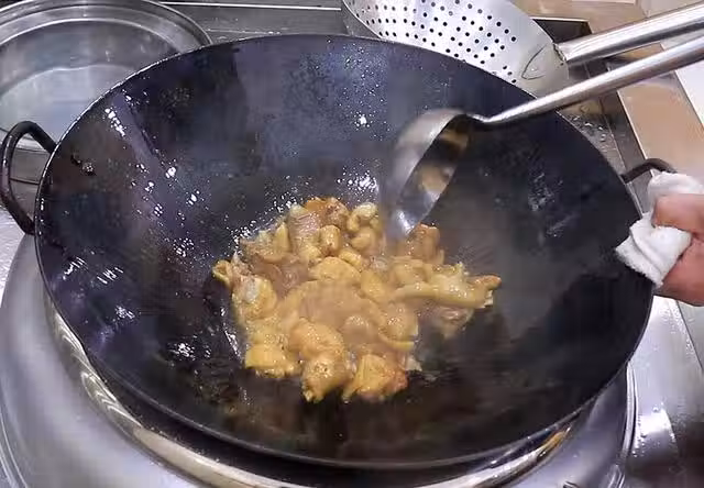 4.沿鍋邊淋入一點料酒翻炒幾下,利用酒精揮發去除腥味,往鍋中倒入雞塊三倍的水,放入板栗,加入蚝油10克、老抽3克,大火燒開以後轉中小火燜煮15分鐘。