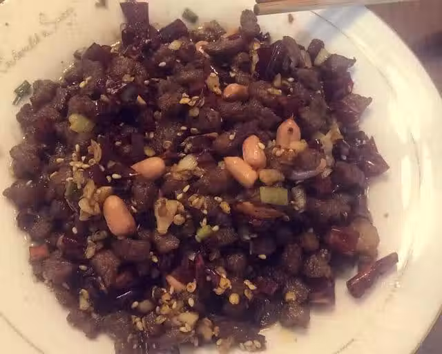 牛肉300克;干辣椒自己能接受的量;蔥1根;蒜1頭;老抽1勺;料酒1勺;生抽2勺;白糖1小勺;花生自己喜歡的量;白芝麻自己喜歡的量