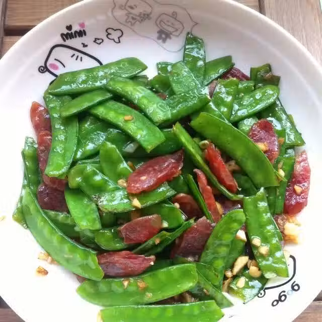 小豌豆適量;臘腸視個人喜好;蒜蓉少許
