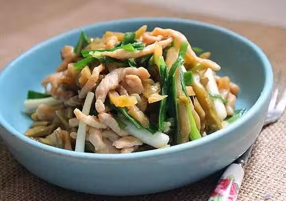豬肉絲150克;榨菜絲50克;小菜段50克;混合油20克;花椒3克;薑絲3克;水澱粉10克;醬油10克