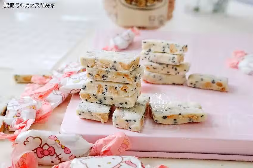 【花生牛軋糖】材料:棉花糖300克,黃油70克,香酥花生200克,黑芝麻35克,奶粉125克,鹽2克